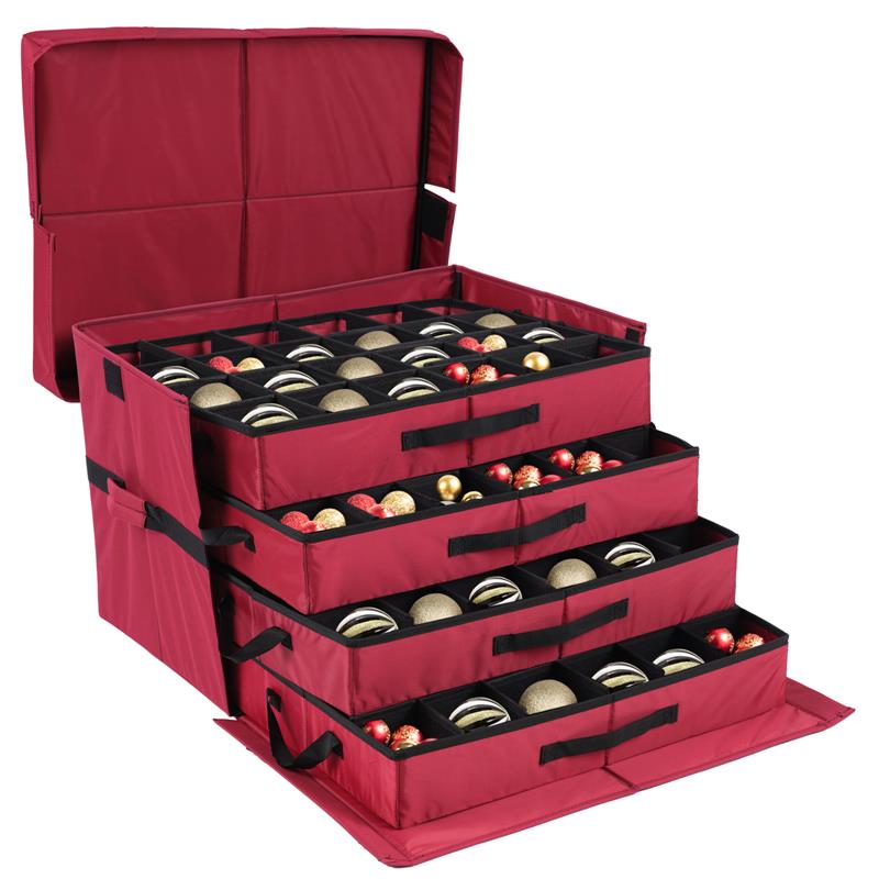 The christmas ornament storage box can store 72/96 decorations, with each individual slot having a diameter of 4 inches (10 cm),adjustable dividers to accommodate the shape and size of your ornaments,and have side walls ensuring that ornaments won't slide off.