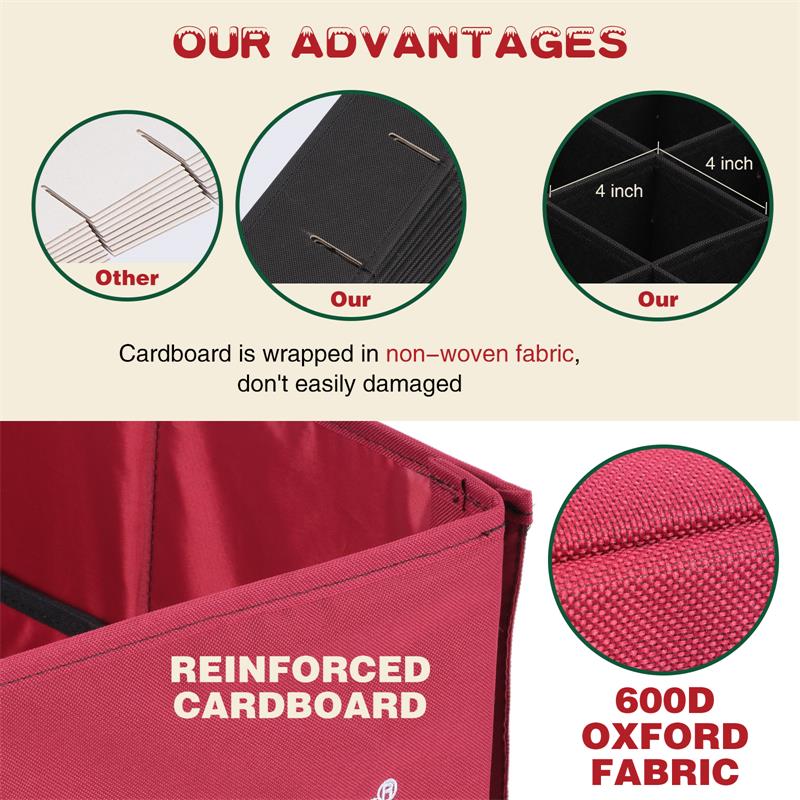 【STRONG & DURABLE】Ornament storage box made of 600d oxford fabric and reinforced cardboard,the cardboard is wrapped in non-woven fabric, making it less susceptible to damage;comes with a sturdy lid;
