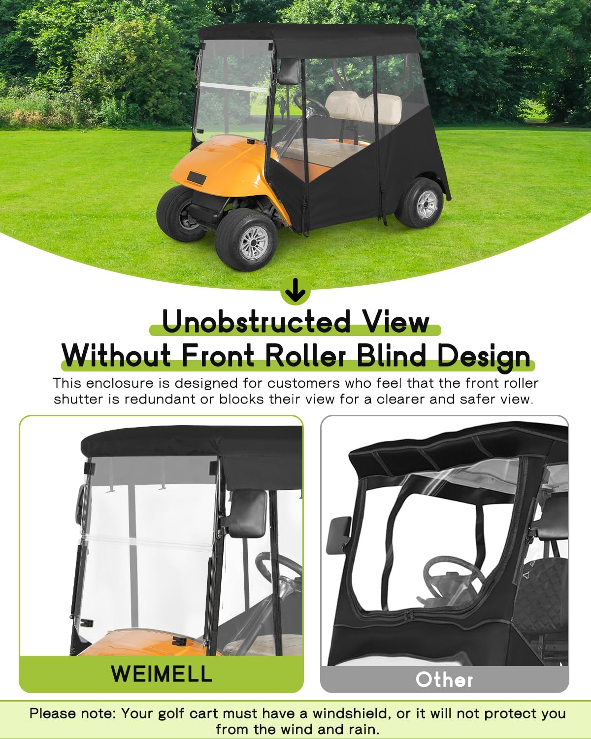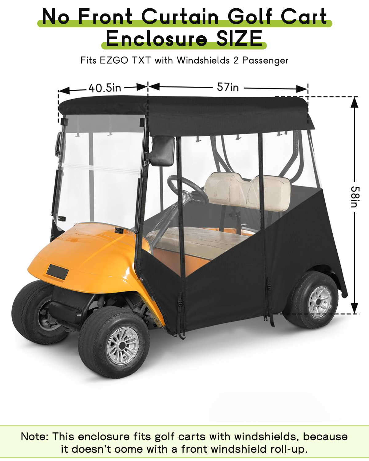 OPEN FRONT WINDSHIELD GOLF ENCLOSURE: This EZGO TXT 2-seater golf cart enclosure is designed without a front roller shutter; it is a 3-sided transparent window + roller shutter door without a front windshield roller shutter, therefore, it is not suitable for golf carts without a front windshield.