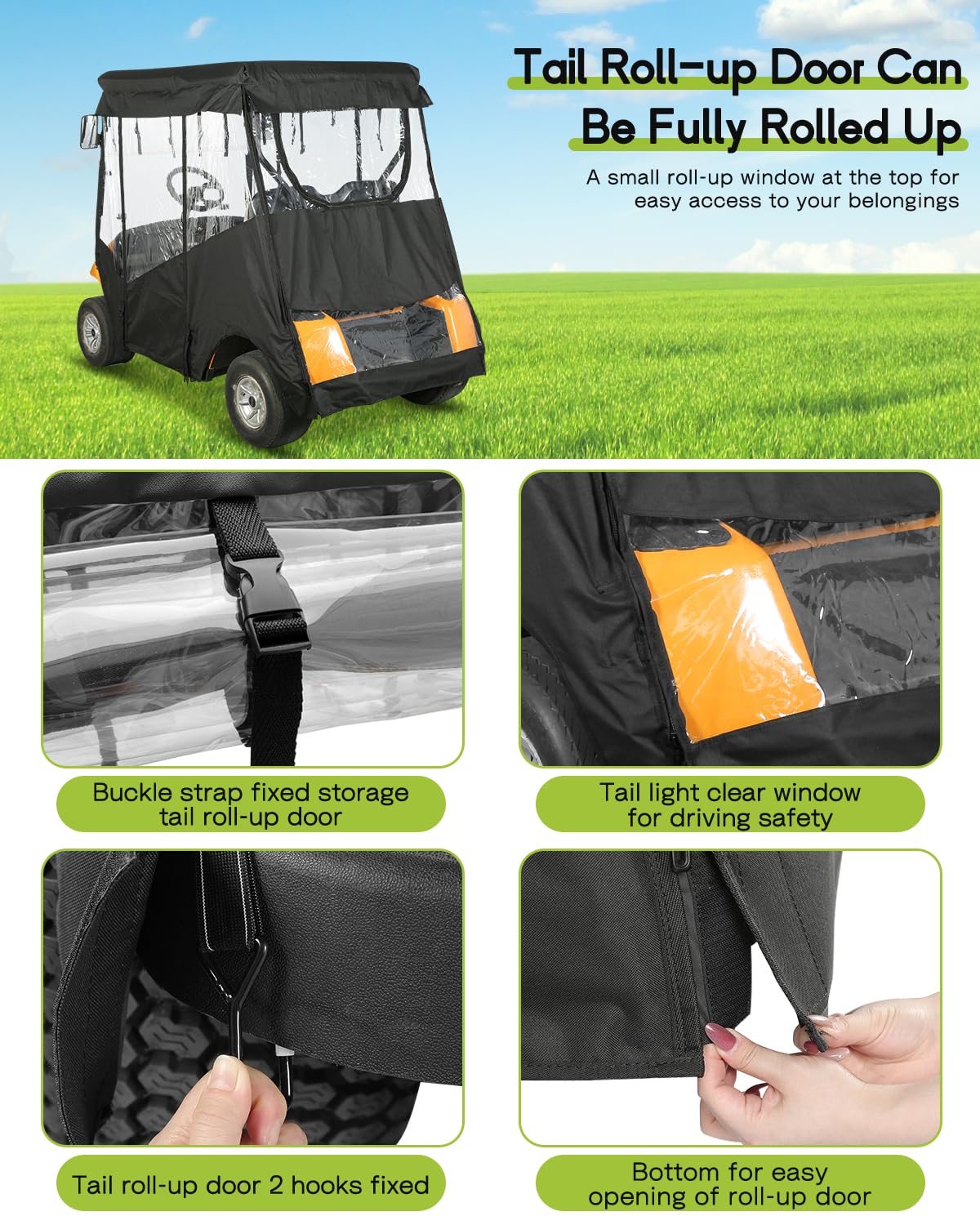 VISIBILITY & SAFETY: This golf cart driving rain cover is designed with a 3-sided clear PVC roll-up door (no front roll-up door design ensures a wider view). The clear taillight transparent window allows you to drive safely both during the day and at night.