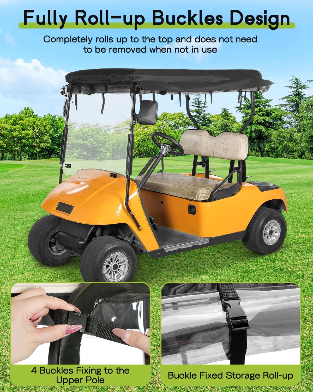 3 SIDES ROLL UP BLINDS DESIGN: The front windshield is an open, curtain-less design, the other 3 sides of the roll up blinds can be pulled up and secured with buckles for storage when not in use, making it easy for you to get in and out of the golf cart and pick up and drop off your items, while ensuring a well-ventilated, wide-open field of vision and a safe drive.
