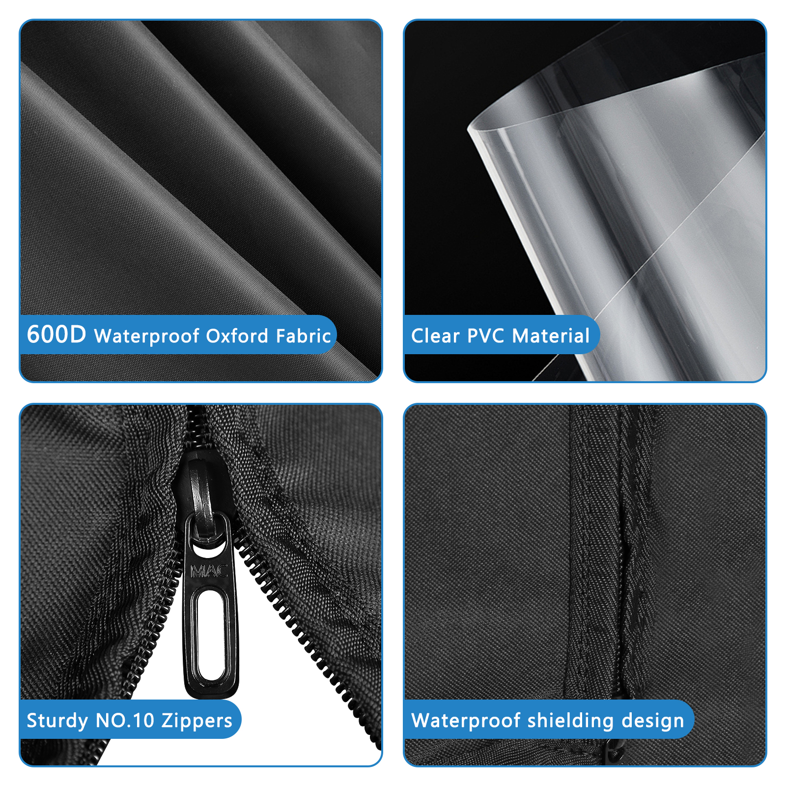 Premium Materials: The transparent window of the golf cart rain cover is made of durable clean PVC, can see clearly out even in windy and rainy weather, ensuring safe driving. The black fabric is made of oxford cloth, It offers excellent waterproofing, high tear resistance, UV protection. It is also a winter golf cart cover that keeps the rain, snow and wind out