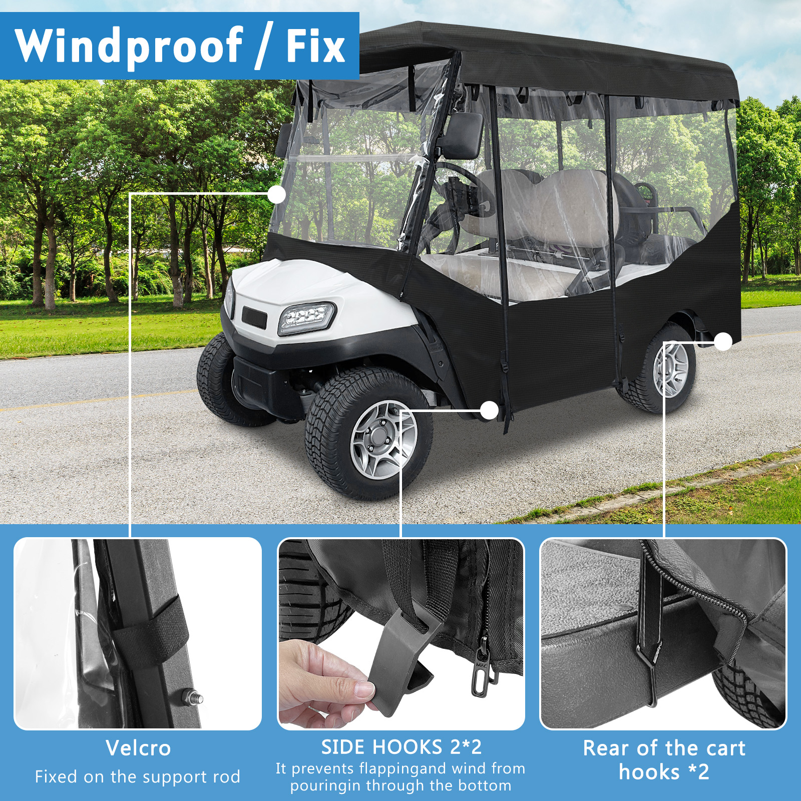 Easy Installation and Windproof: Simply drape the golf cart enclosure over your cart and secure it using adjustable hooks at the sides and back,reinforce with hook-and-loop fastener in front support rod,also reinforce with buckle fixed to the roof support rod inside the cart.
