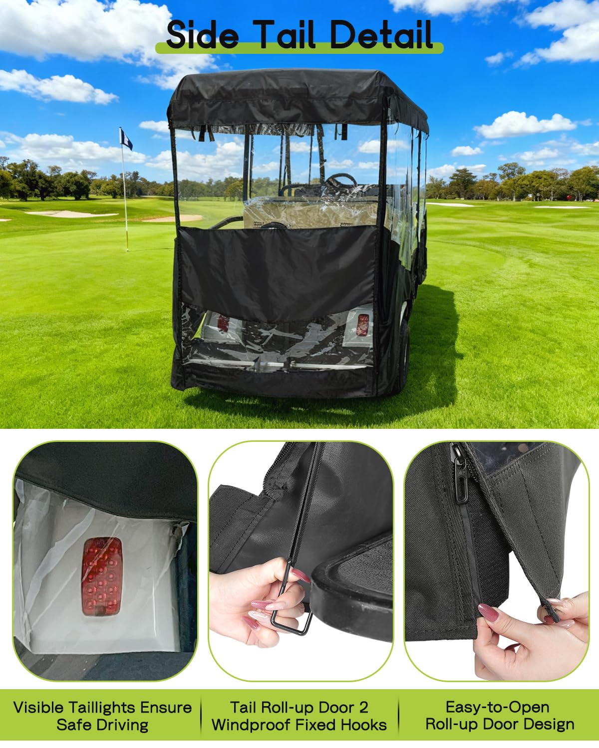 VISIBILITY AND SAFETY: The golf cart rain cover features four clear PVC windows, clear windows for the lights, and zippered openings for the side view mirrors, allowing you to drive safely day and night. To withstand strong winds, on the top of the inside of the cover, 4 buckle adjustable straps are designed to attach to the 4 poles of the golf cart to ensure more stability and firmness.