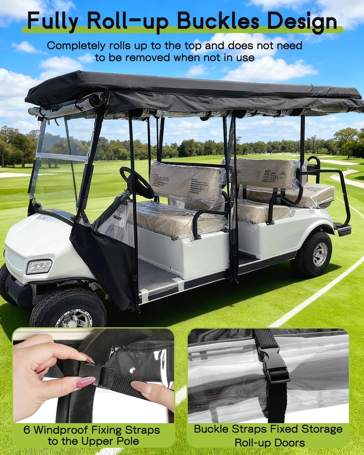 FULL ROLL-UP DESIGN: The front windshield roll-up curtain can be pulled up to the top and secured with a buckle strap when not in use, and the other curtains can be fully rolled up and secured with a buckle strap for storage, making it easy to get in and out of the golf cart and access your belongings, as well as allowing you to ensure ventilation and a wide field of vision while driving safely. No need to disassemble when not in use.
