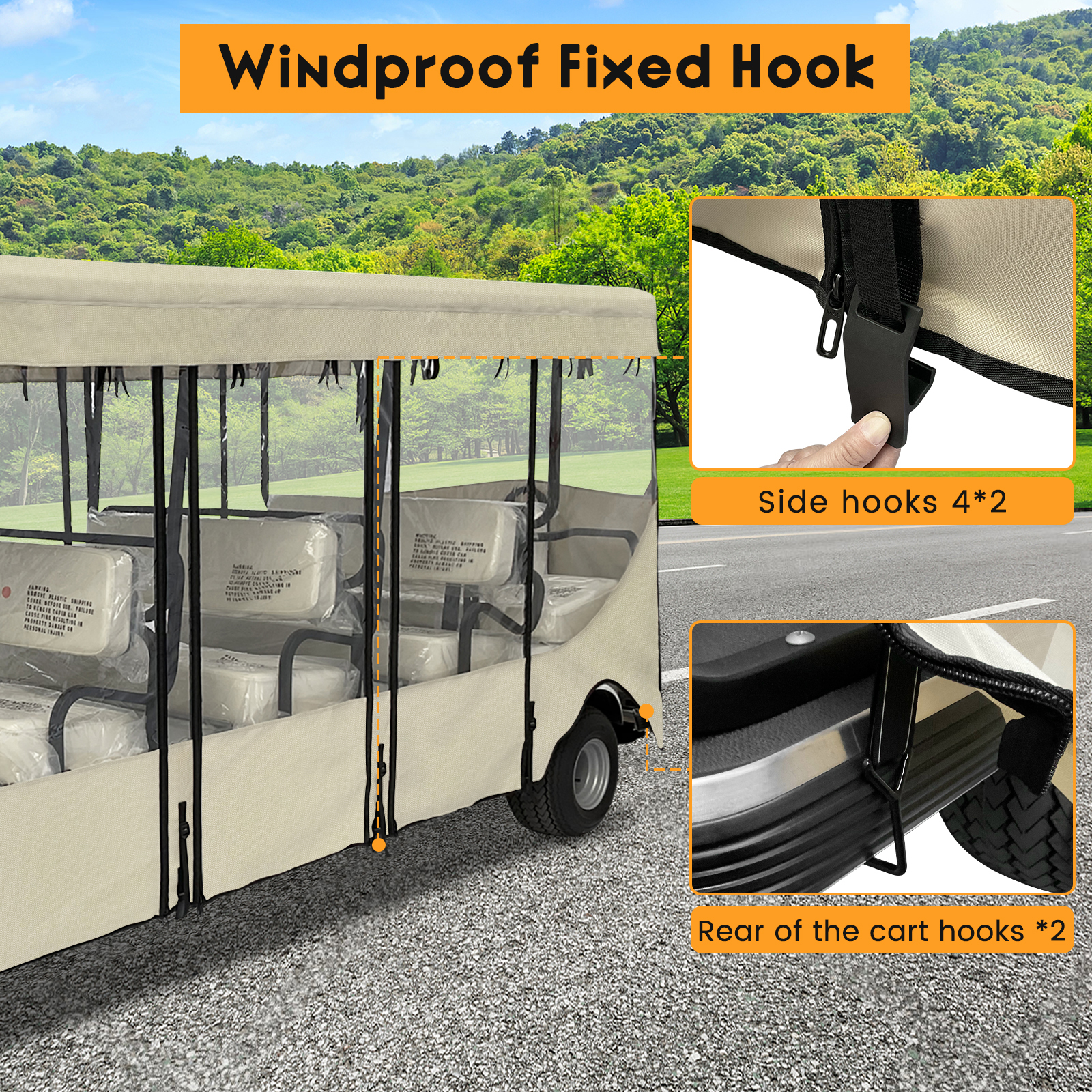 Home » Products » Golf Cart Accessories » Golf Cart Cover » Golf Cart Enclosure for 8 Passenger for Club Car Villager, Waterproof Windproof Driving Rain Cover with 4-Sided Clear Windows Roll-Up Zipper Door - Beige