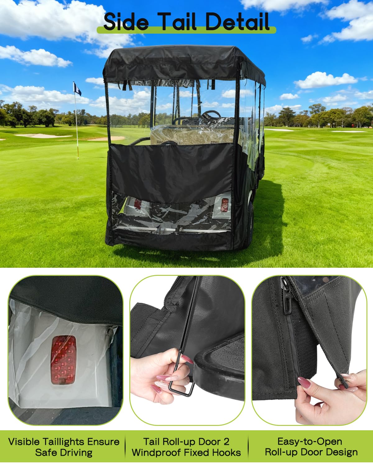VISIBILITY AND SAFETY: The golf cart rain cover features four clear PVC windows, clear windows for the lights, and zippered openings for the side view mirrors, allowing you to drive safely day and night. To withstand strong winds, on the top of the inside of the cover, 8 buckle adjustable straps are designed to attach to the 8 poles of the golf cart to ensure more stability and firmness.