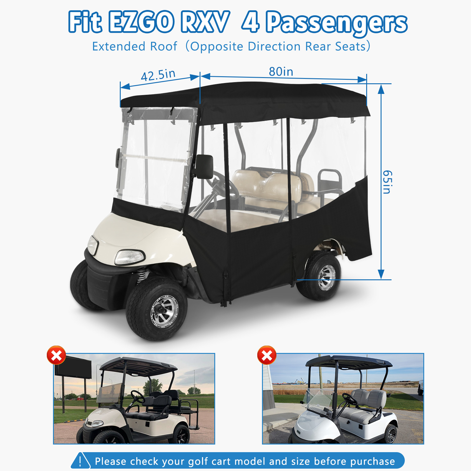 Fit for Rxv Extended Roof 4 Seater:Before purchasing, please check the image and confirm the size&model of your golf cart,This golf cart driving enclosures is designed specifically for ezgo rxv extended roof 4 passenger models(Does Not Fit: short roof 2+2 seats models.),Size:Roof W 42.5" and L 80", Rear H 65"