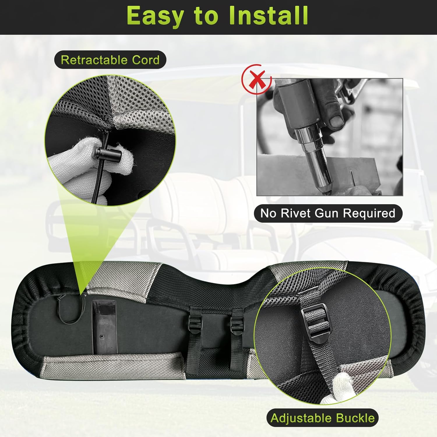 EASY INSTALLATION: Our golf cart seat covers are easy to install, and no tools or nailsare required, just slip the covers over your existing seats and backrests and secure them with adjustable straps and telescopic buckles!