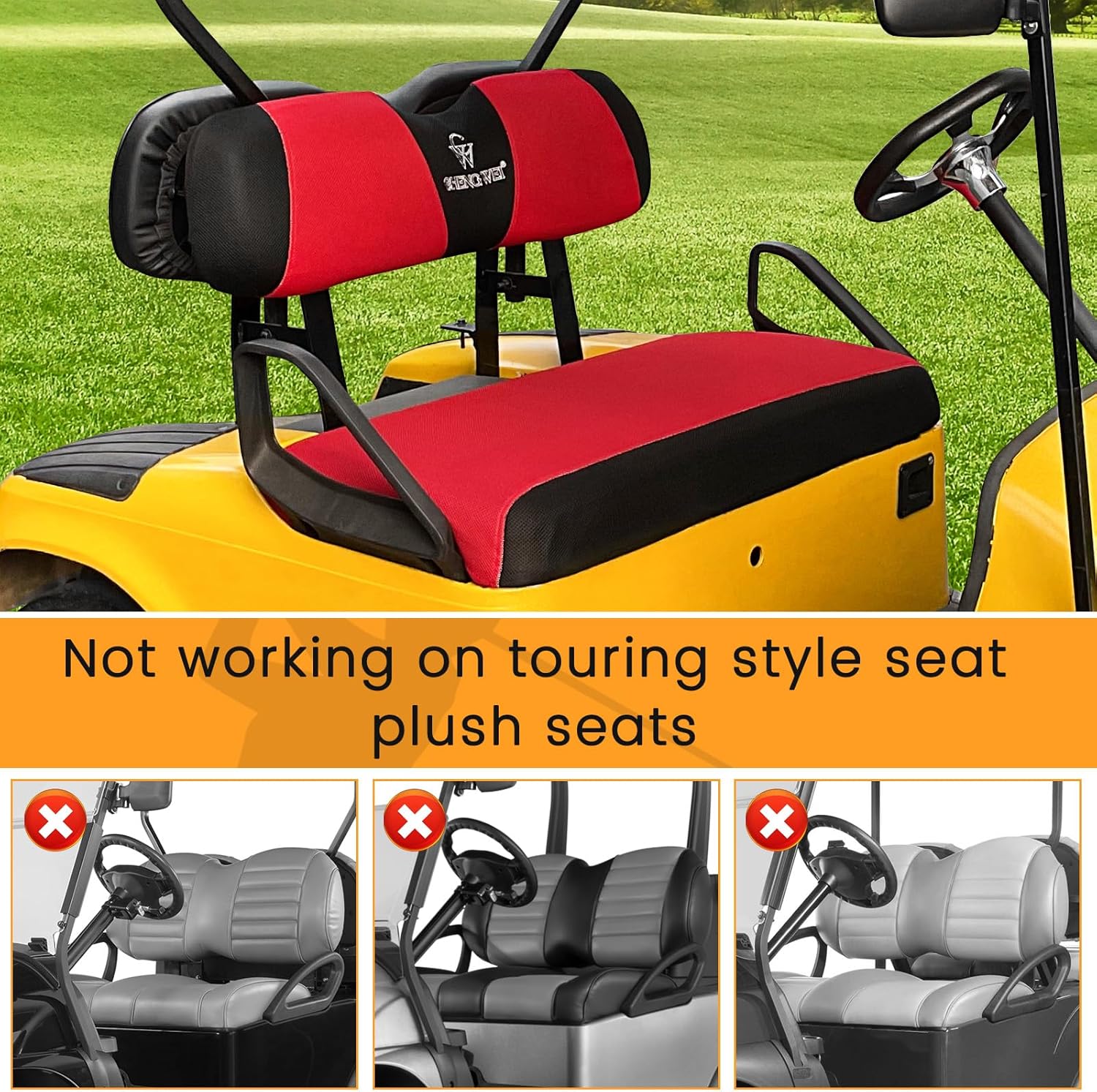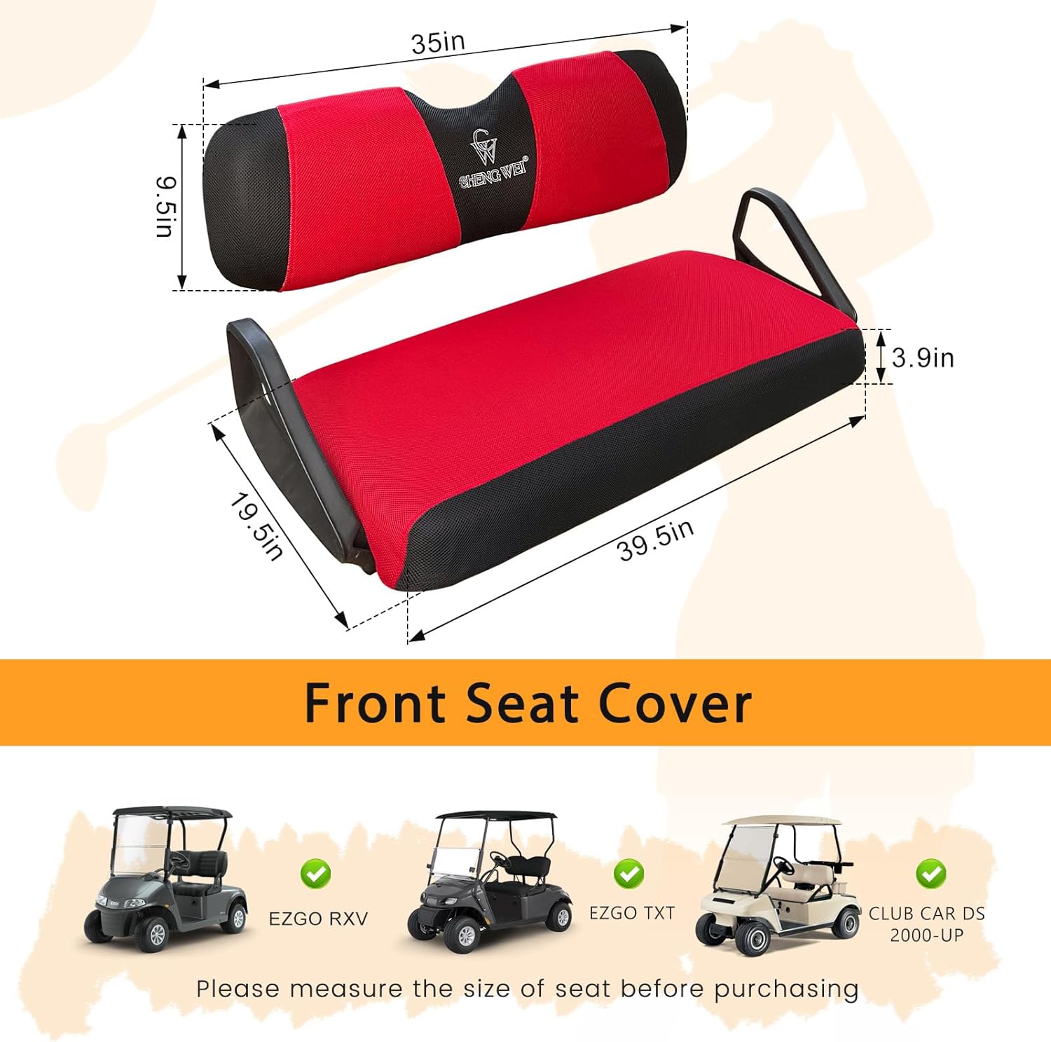 【Stretchy Breathable Fabric】Our golf cart seat covers are made of breathable mesh fabric,keeps seats cool in summer hot sun,much nicer to sit on our ezgo TXT seat covers than the existing vinyl seats on the golf cart.
