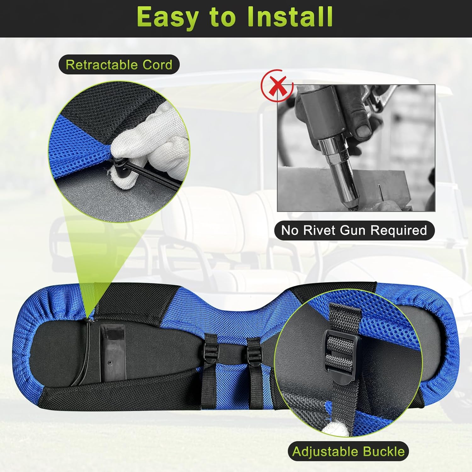 EASY INSTALLATION: Our golf cart seat covers are easy to install, and no tools or nails are required, just slip the covers over your existing seats and backrests and secure them with adjustable straps and telescopic buckles!