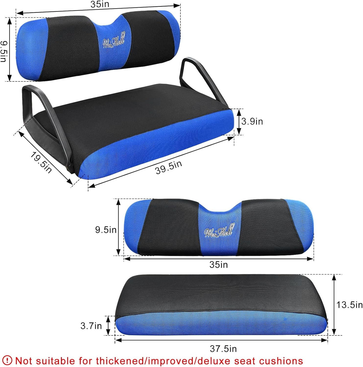 FRONT AND REAR SEAT COVERS FOR MODELS: This golf cart front seat cover fits EZGO TXT RXV Club Car DS (2000-Up) front seat cushions; the rear seat cover fits golf cart aftermarket regular rear seat cushions, not for deluxe/improved/thickened cushions. NOTE: If your car seat has been thickened, widened, or upgraded, please measure your car seat dimensions to make sure the seat cover fits.
