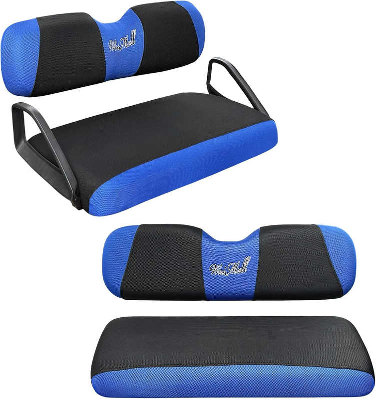 PRODUCT SIZE: Package includes 1 x front seat backrest cover (L 35xW 10 xH 3.7 inches) and 1 x front cushion cover (L39.5xW20xH3.9 inches). 1 x back seat backrest cover (L 35 x W 9.5 x H 3 inches) and 1 x back seat cushion cover (L 37.5 x W 13.5 x H 3.7 inches).About 0.5-inch error is normal, we suggest you measure the size of your golf cart seat before purchasing to make sure it fits your seat.