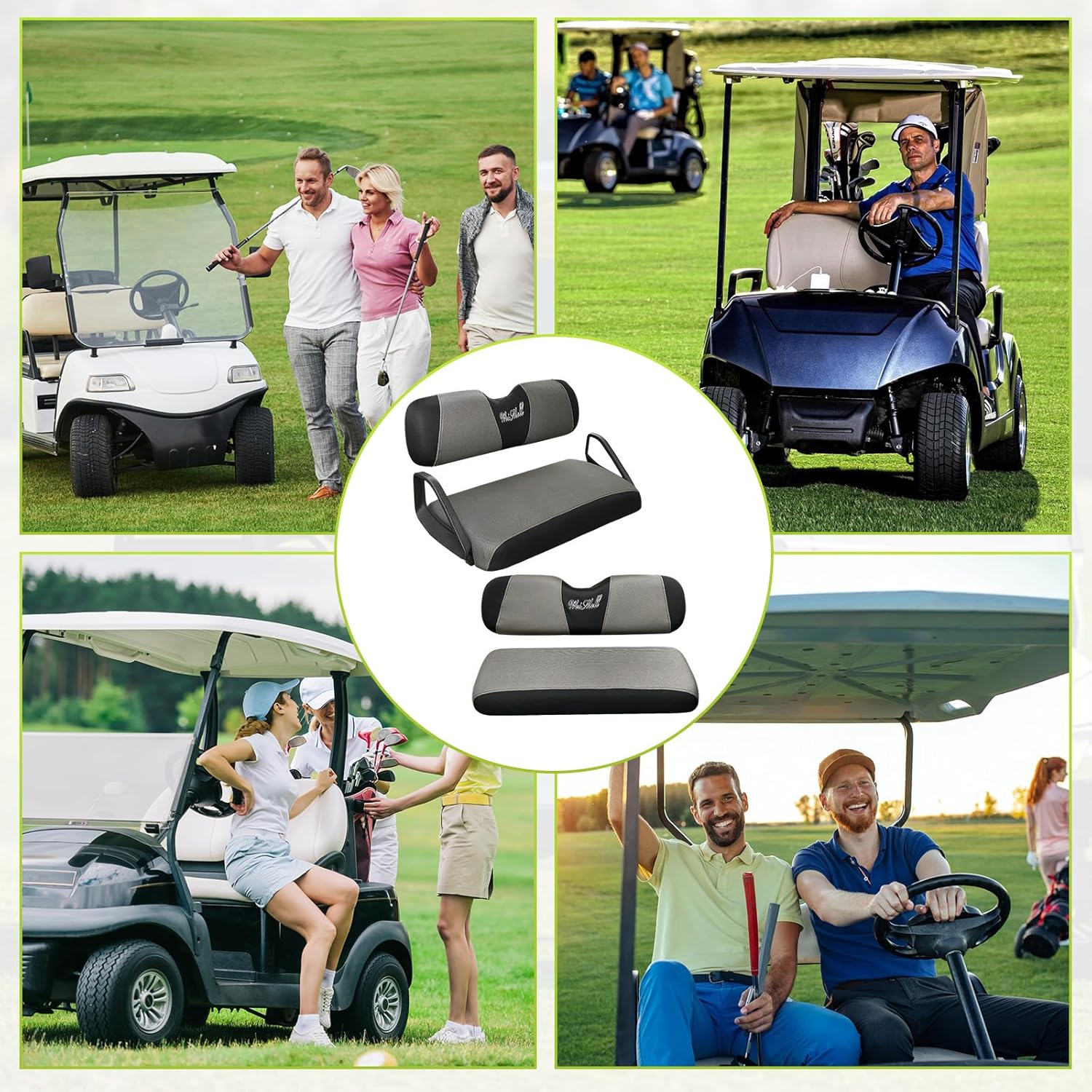 PRODUCT SIZE: Package includes 1 x front seat backrest cover (L 35xW 10 xH 3.7 inches) and 1 x front cushion cover (L39.5xW20xH3.9 inches). 1 x back seat backrest cover (L 35 x W 9.5 x H 3 inches) and 1 x back seat cushion cover (L 37.5 x W 13.5 x H 3.7 inches).About 0.5-inch error is normal, we suggest you measure the size of your golf cart seat before purchasing to make sure it fits your seat.