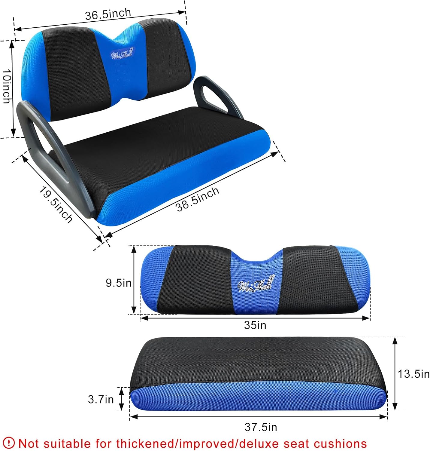 PRODUCT SIZE: Package includes 1 x front seat backrest cover (L 36.5xW 10 xH 5.9 inches) and 1 x front cushion cover (L 38.5 x W 19.5 x H 3.9 inches). 1 x rear seat backrest cover (L 35 x W 9.5 x H 3 inches) and 1 x rear seat cushion cover (L 37.5 x W 13.5 x H 3.7 inches).About 0.5-inch error is normal, we suggest you measure the size of your golf cart seat before purchasing to make sure it fits your seat.