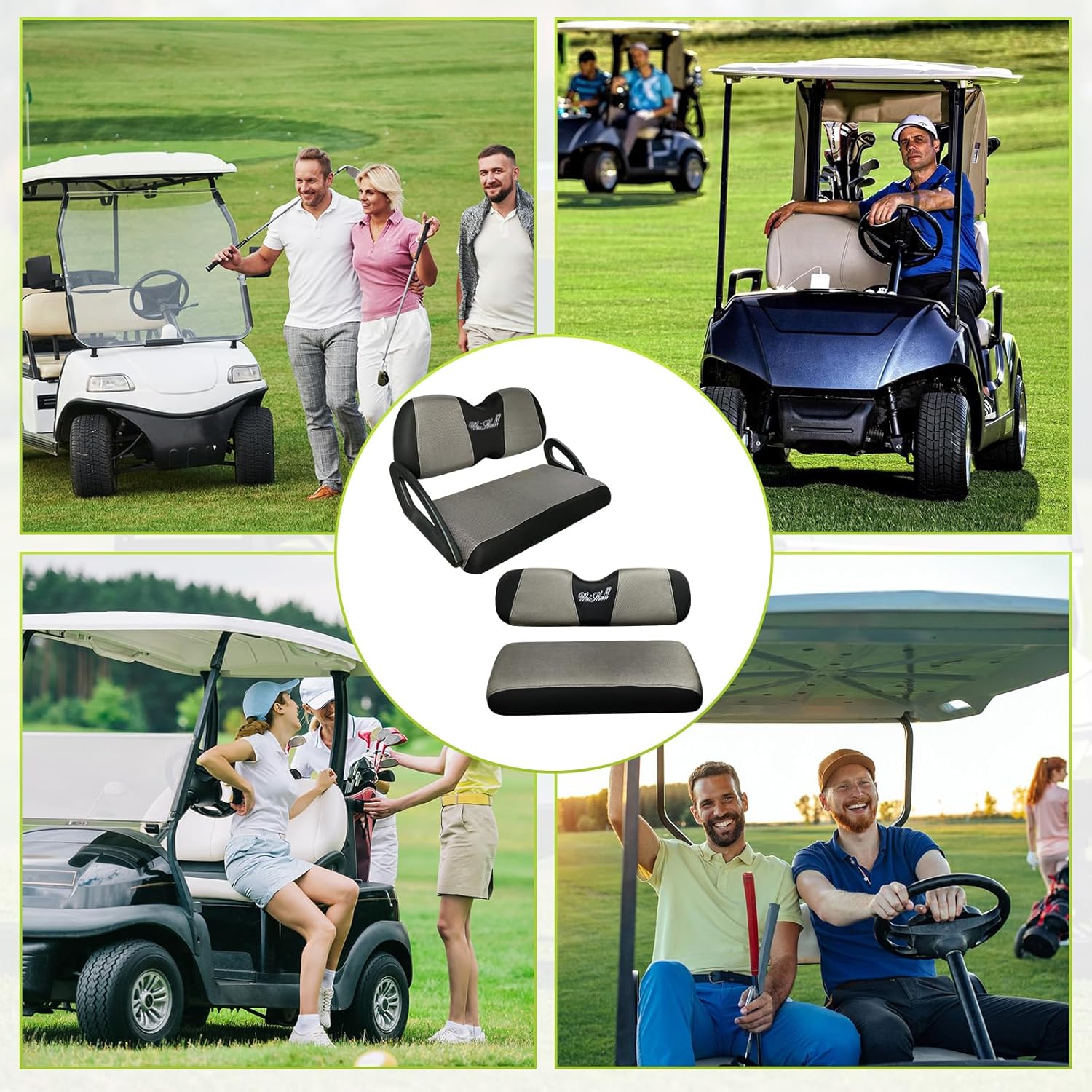 PRODUCT SIZE: Package includes 1 x front seat backrest cover (L 36.5xW 10 xH 5.9 inches) and 1 x front cushion cover (L 38.5 x W 19.5 x H 3.9 inches). 1 x rear seat backrest cover (L 35 x W 9.5 x H 3 inches) and 1 x rear seat cushion cover (L 37.5 x W 13.5 x H 3.7 inches).About 0.5-inch error is normal, we suggest you measure the size of your golf cart seat before purchasing to make sure it fits your seat.