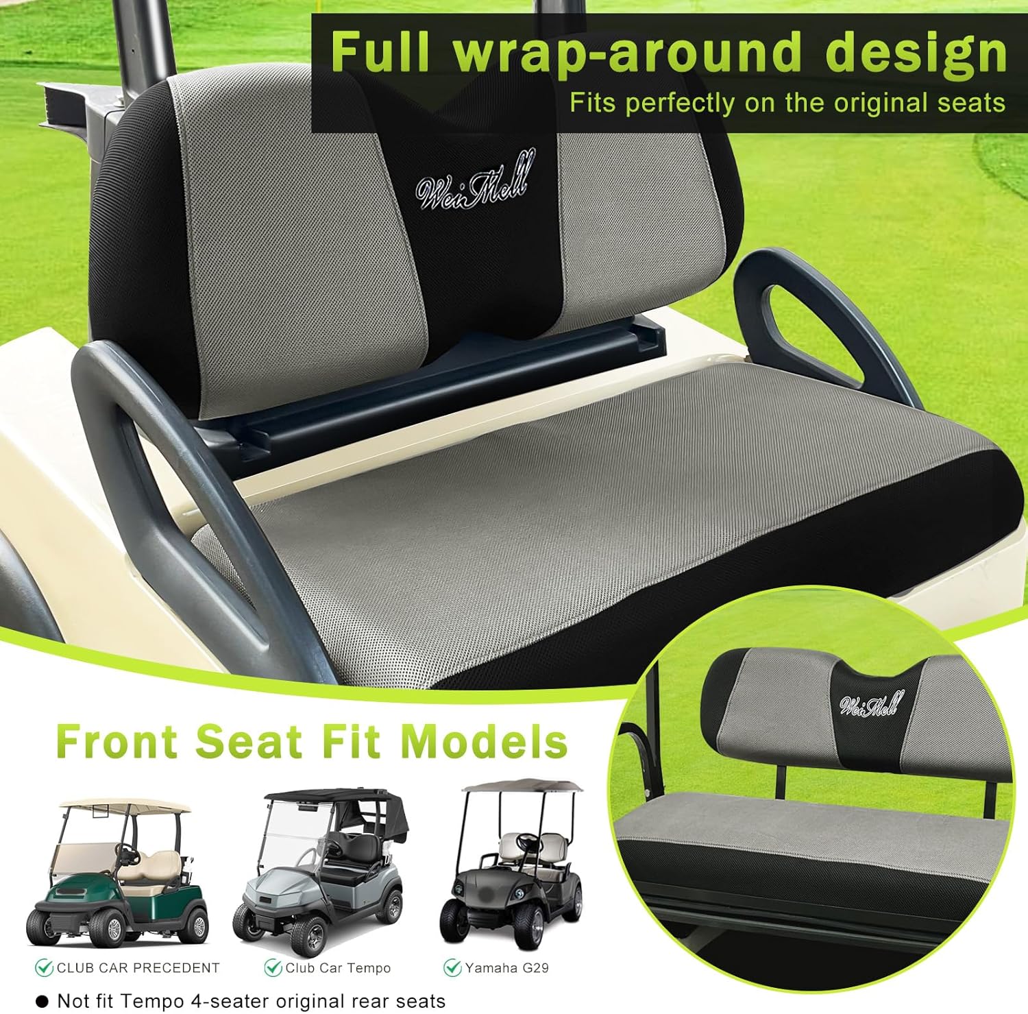 FRONT AND REAR SEAT COVERS FOR MODELS: This golf cart front seat cover fits Club Car Precedent TEMPO YAMAHA G29 front seat cushions; this rear seat cover fits golf cart aftermarket regular rear seat cushions, not for deluxe/improved/thickened cushions. NOTE: If your car seat has been thickened, widened, or upgraded, please measure your car seat dimensions to make sure the seat cover fits.