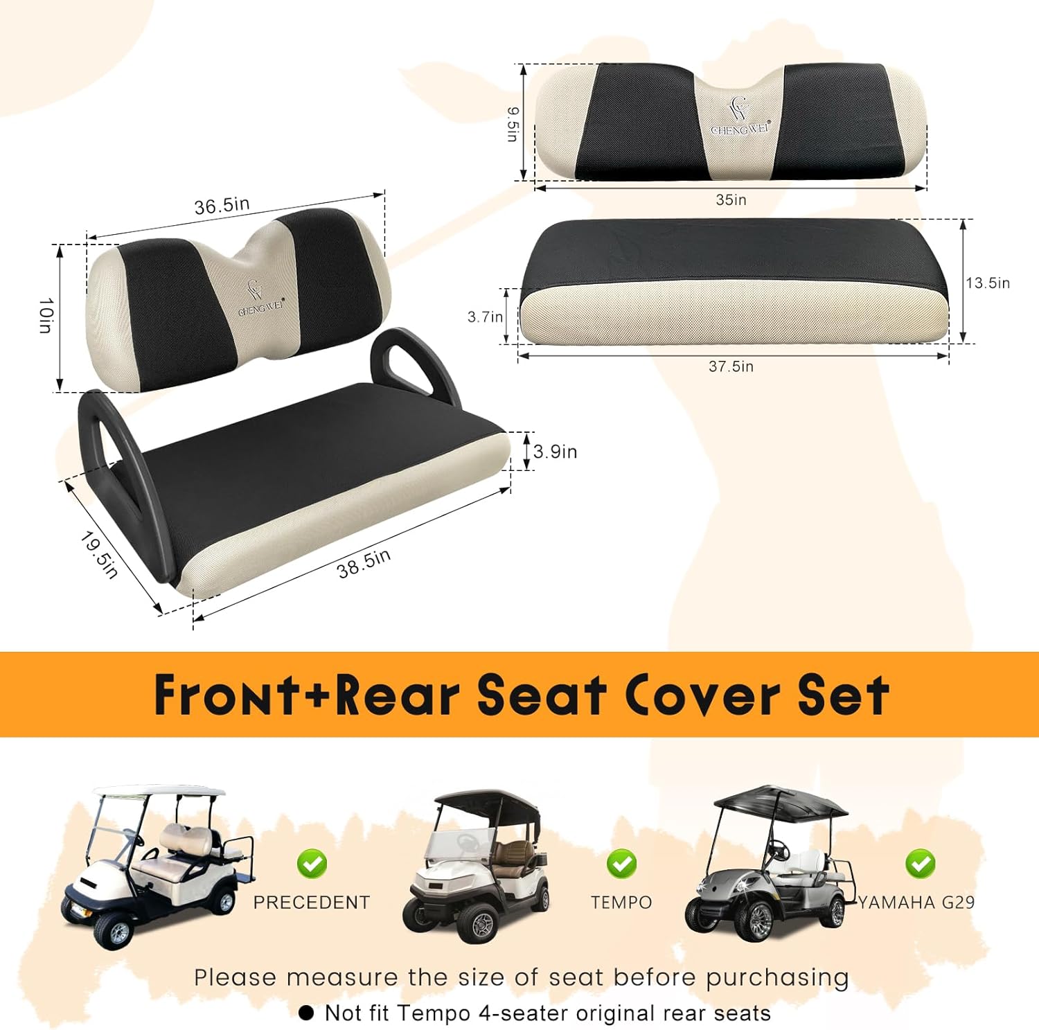 Fit Models: Front and Rear seat covers kitis only suitable for Club Car Precedent Tempo and Yamaha G29 golf cart original regular seat cushions, Our golf cart seat covers are carefully crafted to ensure a perfect match with your seats. Note: Not suitable for thicker luxury cushions, please measure your seat size before purchase.