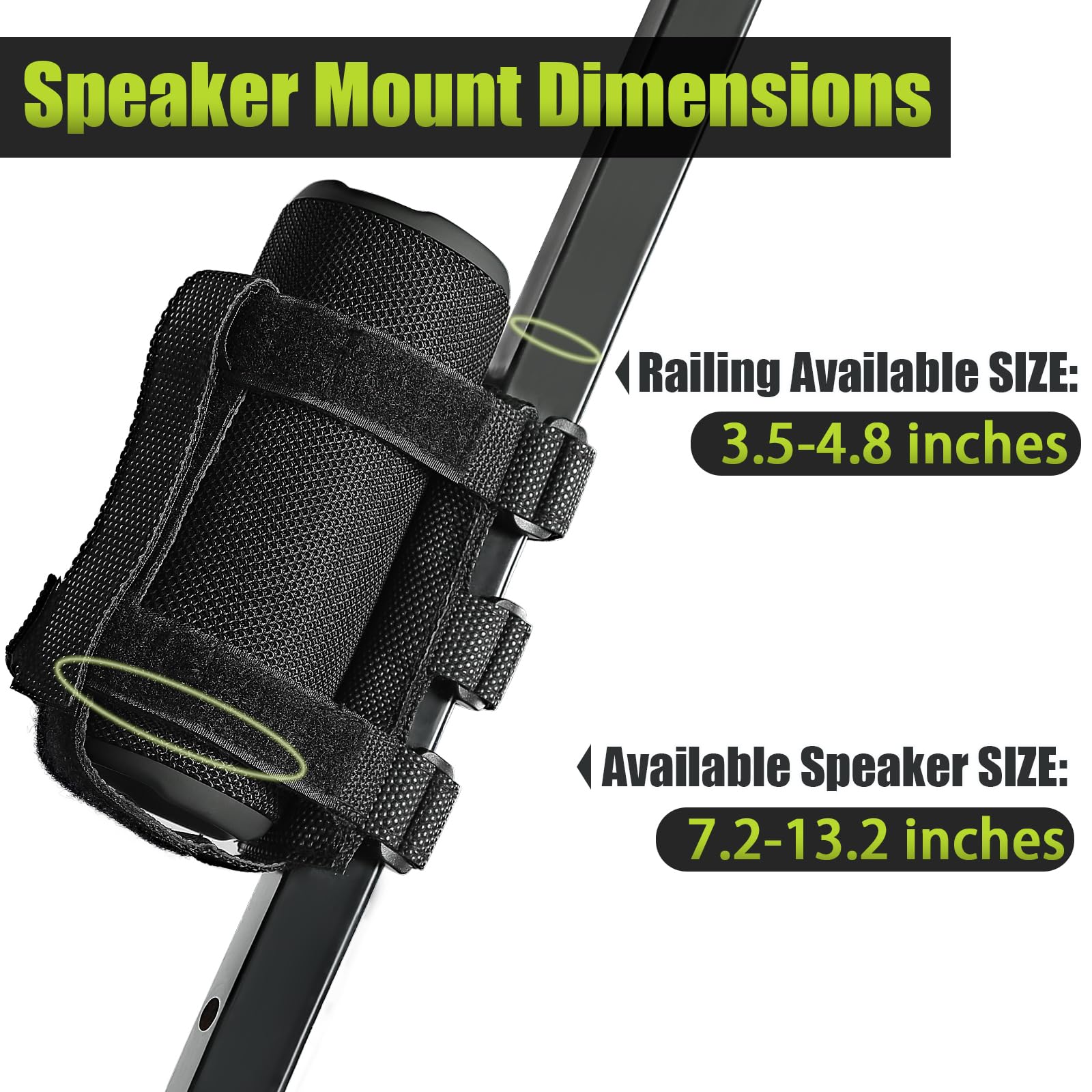 SIZE: The speaker mount length is 19.1 inches, and its maximum inner ring circumference is 13.2 inches. It can fit 3.5-4.8-inch bars, rails, and frames. The mount is designed with non-slip bumps, so you don't need to worry about dropping it.